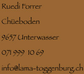 Seit 2004 züchten wir Wooly Lamas höchster Qualität. Die kleine Herde vergnügt sich jeden Tag auf den grünen Weiden des Chüebodens in Unterwasser und erfreut Besucher von nah und fern.